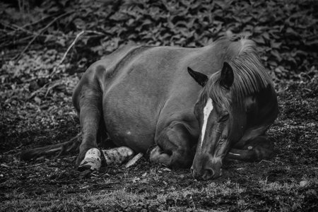 the horse is lying on the ground