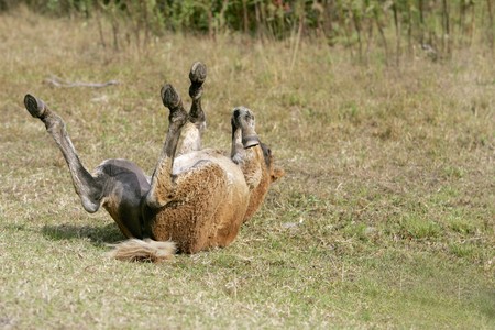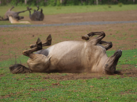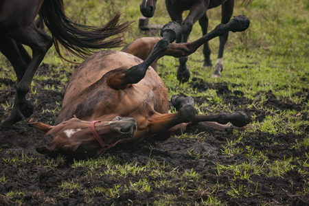 Horse rolling in the mud in an open grass field