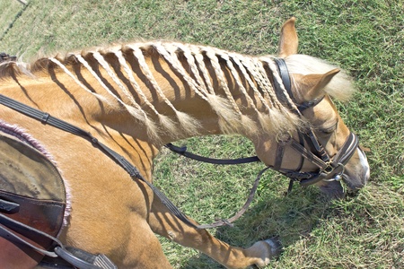 Horse with bright braiding on mane grazing