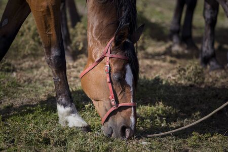 Detail of a brown horse head eating grass.