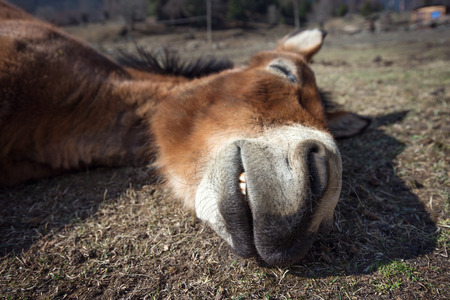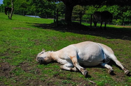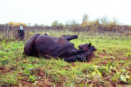 Horse sleep outside on pasture