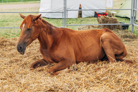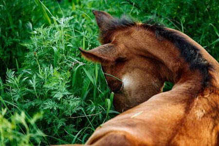 Close-up of a cute brown foal sleeping on the cut grass. Molting foal resting in the herd on a summer sunny day