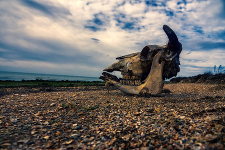 The skull of a bull-cow on the lake shore. Dead cattle are becoming less common in Europe. The reason is from a decrease in the death rate to the rapid artificial destruction of corpses