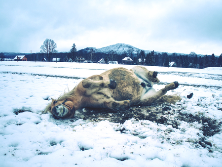 White horse in the snow free lies. For horses is rolling in fresh snow very popular game.