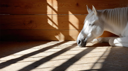 A moment of tranquility captured as a horse rests quietly in its stall, light casting long shadows on the wooden floor