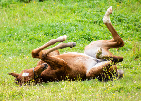A young horse joyfully rolls on its back in a lush green field filled with wildflowers. The horse seems to be enjoying the warm sunlight in a serene outdoor setting.