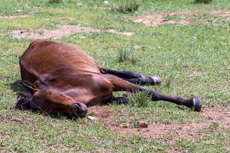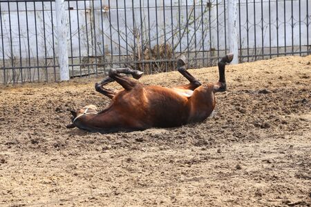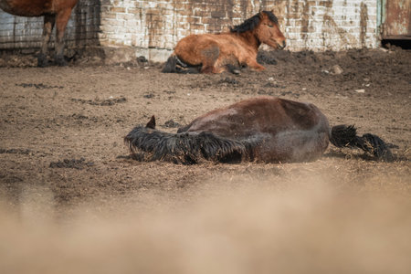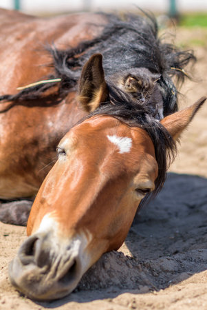 Brown wild horse lying on sand. Agricultural mammals animals in natural environment.