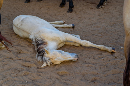 White horse sleeping on the ground in the park. Animal concept.