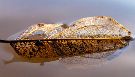 A delicate, lace-like leaf skeleton floats serenely on the still surface of the water, its intricate veins reflected below.