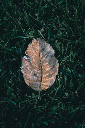 Brown golden dead fallen autumn leaf on a green background