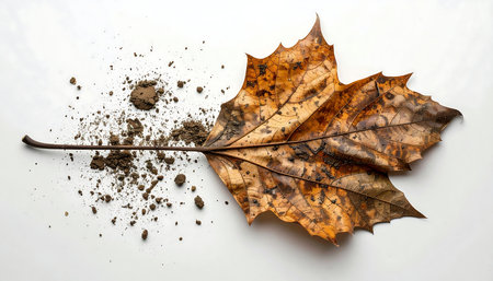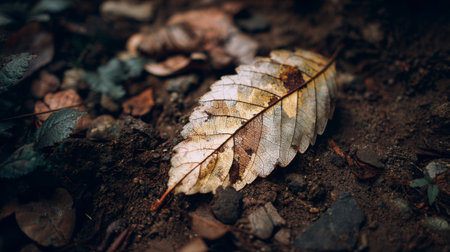 A stunning close-up of a brown leaf resting on rich soil, surrounded by organic material, captures the essence of autumn in nature