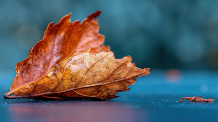 A striking image featuring a single dry brown leaf resting on a smooth blue background, emphasizing textures and colors that evoke feelings of tranquility.