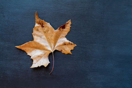 Dried and dead Autumn Sycamore leaf shot over a textured black blue wooden background or table. Top view.