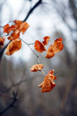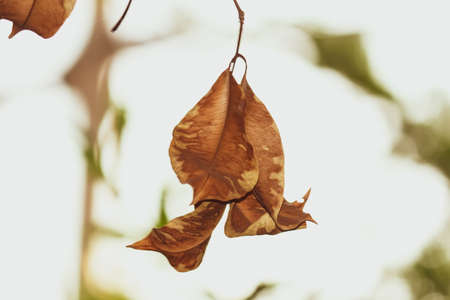 Dry leaves hanging downwards from a tree during the autumn season showing its change of colour from green to brown