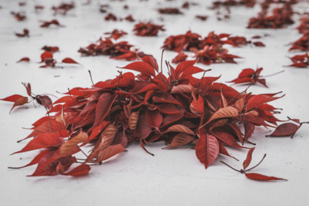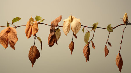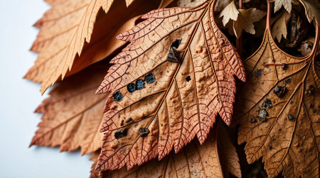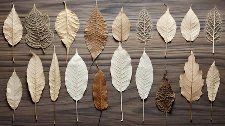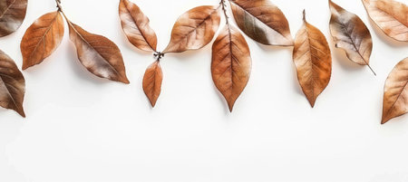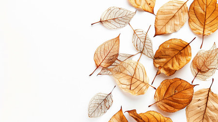 A captivating arrangement of dry leaves on a clean white surface, highlighting the intricate textures and colors of nature in a minimalist design.
