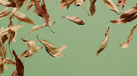 Autumn background with flying dry leaves on a green and brown color background, with copy space available. --chaos 30 --ar 16:9 --v 6.1 Job ID: a16aa82e-b91a-4c1a-b2f4-3d21316e6261