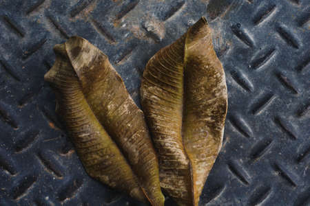 Dry blackened walnut leaves on ground in fall. Gloomy autumn background