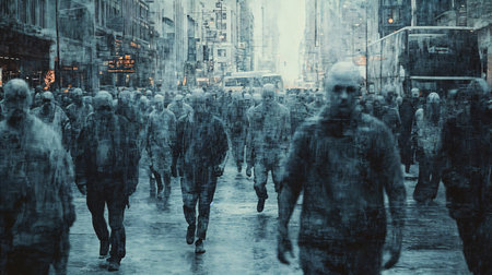 Crowd of people walking down a busy city street, representing consumerism, advertising, and modern society