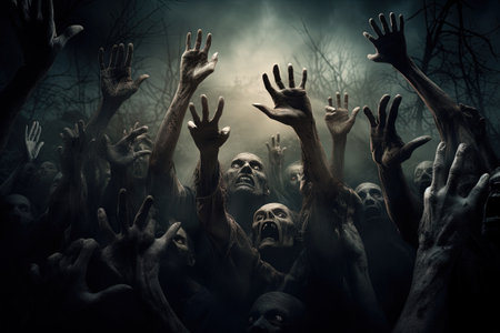 Illustration of crowd of many hands reaching out from the ground, on a dark background, in the horror style, as a halloween decoration, with high resolution photography, hyper realistic and super detailed.