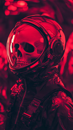 Astronaut with skull in helmet, eerie red lighting. Futuristic and surreal concept