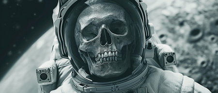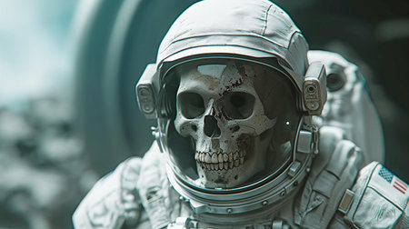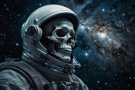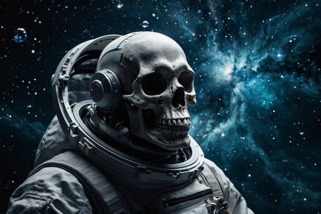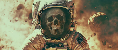 Astronaut with skull and helmet against space background. Elements of this image furnished by NASA