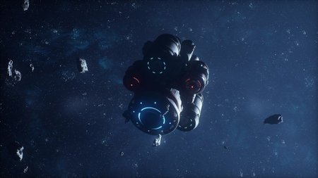 Somewhere in distant space, an astronaut hovers inside his spaceship. 3D Rendering.