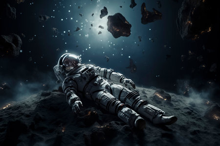 An astronaut floats amidst space debris, backlit by distant stars, highlighting the vastness and solitude of space