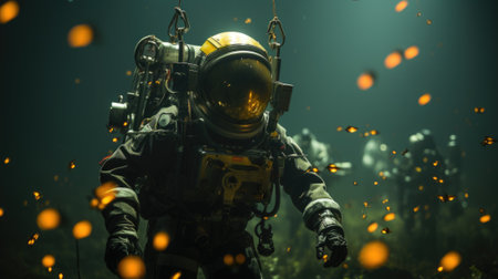 A man in a space suit walking through a field. Generative AI image.