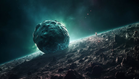 Asteroids surrounding mysterious planet in deep space with cosmic dust.