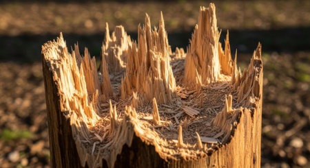 Close up view of a broken tree stump with sharp, splintered wood fibers and rough texture, illuminated by natural sunlight in an outdoor setting.