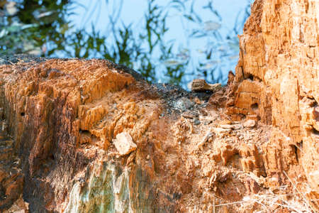 Petrified wood stone background with ancient fossilized bark textures in earthy tones.