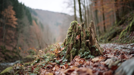A moss-covered tree stump stands on a forest path covered in autumn leaves.