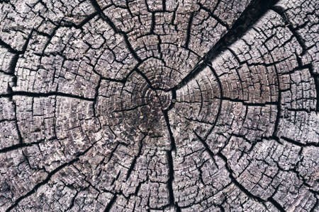 Old grey brown wood cut texture. Grunge dark background closeup. Detailed texture of a cracked section of a tree.