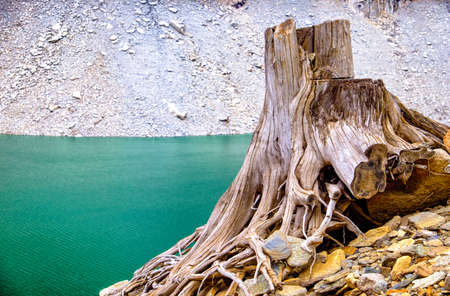 dead tree trunks and roots at a lake