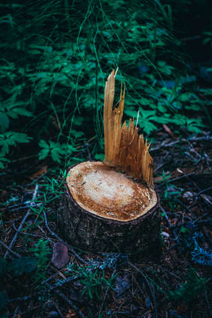 A felled tree in a forest, stump. Environmental problem concept.