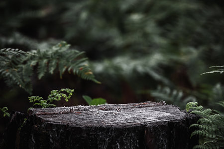 Wooden stump in the forest with ferns and ferns. High quality photo
