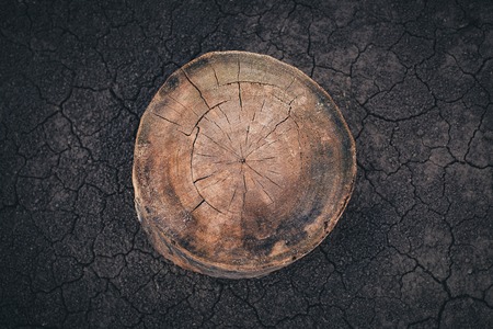 Dark brown dramatic photo of an old weathered stump. Wood nature background.