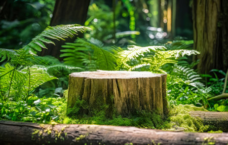 This image features a rustic wood stump covered in soft moss, surrounded by a lush green forest, embodying the serene beauty of nature.