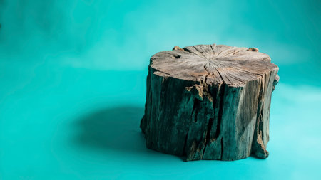 This image features a weathered, rustic tree stump with a rough, textured wood surface, expertly isolated on a vibrant teal background. The natural trunk, displaying unique grain and texture, presents an ideal product display or presentation element. Its rustic charm makes it a perfect stage, pedestal, or platform for showcasing items. Utilize this high-quality image as a striking mock-up or backdrop, offering empty space for your creative projects.