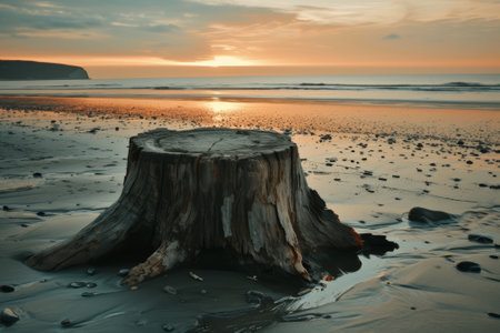 Sunset at a serene beach with a tree stump in the foreground