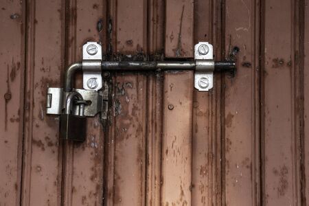 Closeup of a steel door with a safety lock and chain around the handle providing secure access to a designated safety zone within the factory