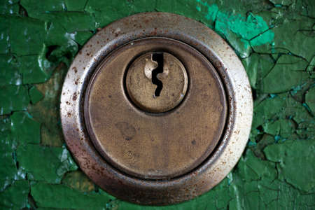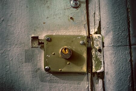 Iron lock closed the wooden door. Security, data storage. Outdated protection against apartment thieves.