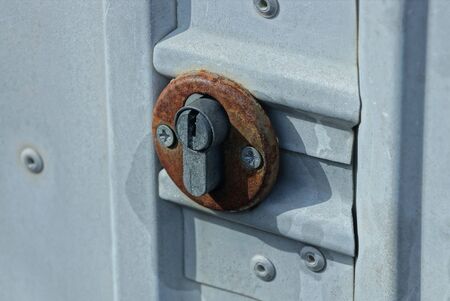 Detailed close-up image of a rusty metal lock on a weathered surface, showcasing the charm of vintage aesthetics and industrial textures. Perfect for design use.