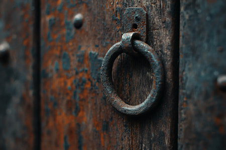 An ornate, weathered door knocker hangs from an old wooden door, showing intricate details and a rich history through its tarnished surface and vibrant textures.