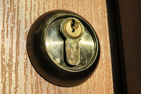 A detailed close-up image of a metal keyhole set in a cylindrical metal surface. The keyhole is centered and appears to be part of a door or a similar structure.