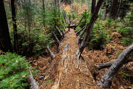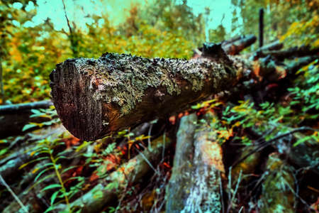 forest landscape, coniferous forest in autumn, logs