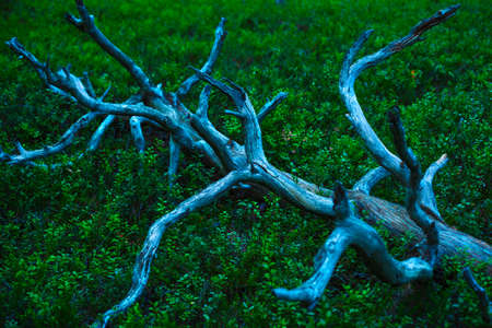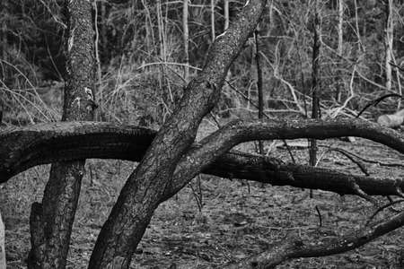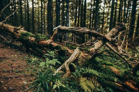 Spooky big branches of broken trees in the forest.