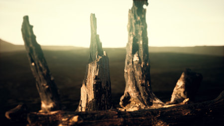 Ancient tree stumps stand silently against a vast, barren landscape, illuminated by the warm hues of a setting sun, evoking a sense of tranquility and timelessness in natures beauty.