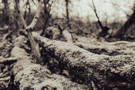 Dark spooky occult pagan witchcraft ritual legend forest roots branches texture. Photo wallpaper background in retro vintage faded processing
