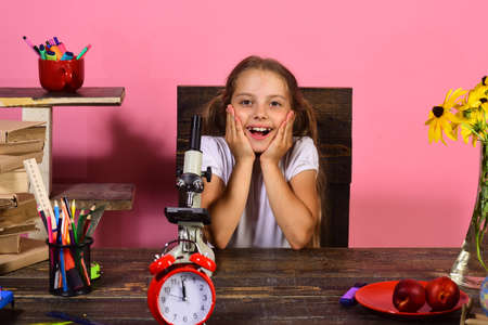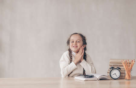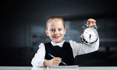 Smiling little girl holding alarm clock. Time to study and back to school concept. Happy schoolgirl sitting at desk with notebook and pen in hand. Time management. Research and education in school.